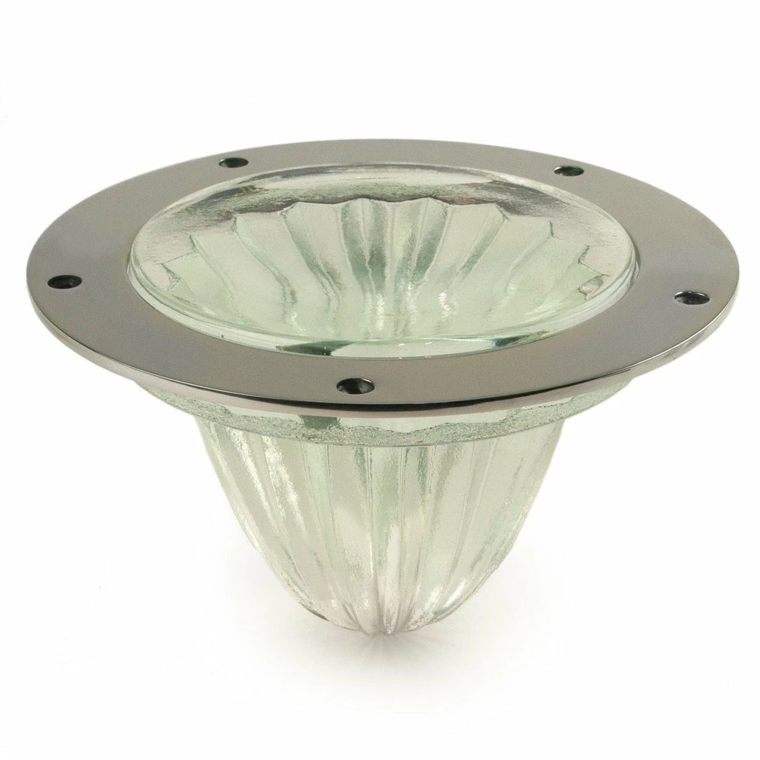 Manufactured in England and available with a polished bronze or a chromed stainless steel these solid-glass prisms have the greatest light output, but also the greatest depth.