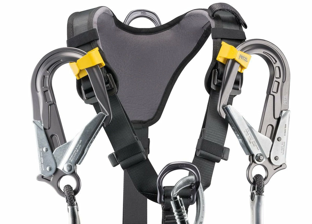 – stowage system for the MGO connectors on fall arrest lanyards, on each shoulder strap, allows the user to be unhindered by the lanyard and keep the connectors within reach. In case of a fall, this system releases the MGO connectors and allows the absorber to be deployed