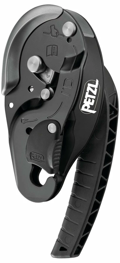 Self-braking descender for rescue, with anti-panic function and no gate, that allows descent control, easier movement on inclined or horizontal terrain and positioning at the work station without the need to tie off the device. The anti- panic function only activates if the user pulls too hard on the handle. the I’D L descender has an anti-error catch to reduce the chance of an accident.