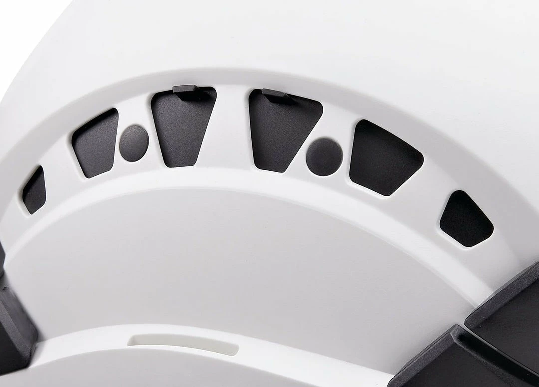 – DUAL chinstrap allows the worker to adjust chinstrap strength in order to adapt the helmet to different environments: work at height (EN 12492) or on the ground (EN 397). The clip has two positions, corresponding to these two uses: high strength, limiting the risk of losing the helmet during a fall, and low strength, limiting the risk of strangulation if the helmet is snagged while the user is on the ground